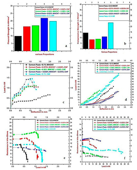 The resistance versus load graph of the structural components (beam and column) embedded with cement-based nano composite sensors indicates z variation in resistance under the loads, as presented in Figure 8c–f. Initially, an increase in the resistance is found, and later on a decrease in resistance is found. However, under the failure load, small increments in the resistance value are observed, as shown in Figure 8c–f. This is due to structural components being subjected to large amounts of load, as a result of which electrical networks that were formed between the nanomaterials were broken, leading to the increase in resistance. Due to continuous loading, the failure of the structures includes crack formations. During this phenomenon, all the nanomaterials will come closer, and again there will be a formation of an electrical network, which increases the conductivity path, hence resistance decreases. However, at the time, the failure load reached all networks, causing breaks, hence an increase in the resistance was observed. Thus, we can conclude that under the failure load, small incremental resistance occurs, which will help to identify the damage and collapse of the structural component. The cement-based nanocomposite embedded sensor has greater strength than the structural element, as explained above. When the structure fails, these sensors exhibit piezoresistive properties by showing variation in resistance. This property is useful for monitoring the health of the structures.