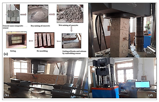 (a) Preparation of structural component beam and column by embedding cement-based sensor (b) Test set up for flexural test on beam (c) Test set up for column subjected compression load (d) UTM of 100-ton capacity.
