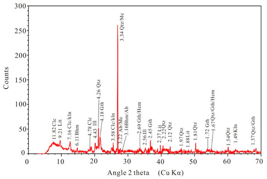 An X-ray pattern of the studied FMNs from the study area. Qtz-quartz; Gth-goethite; Clc-clinochlore; Ill-illite; Kln-kaolinite; Bhm-boehmite; Ab-albite; Mc-microcline; Lit-lithiophorite; Hem-hematite.