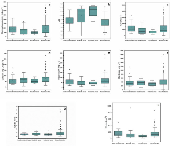 Distribution and variation in (a) EC, (b) pH, (c) TDS, (d) Ca, (e) Mg, (f) hardness, (g) turbidity and (h) chlorides of the studied area. Group 1 (small residential areas), group 2 (roadside areas), group 3 (industrial areas) and group 4 (household sites). Diamond symbols showing the outliers of the data.