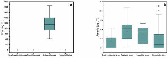 Distribution and variation in (a) iron and (b) arsenic. Group 1 (small residential areas), group 2 (roadside areas), group 3 (industrial areas) and group 4 (household sites). Diamond symbols showing the outliers of the data.