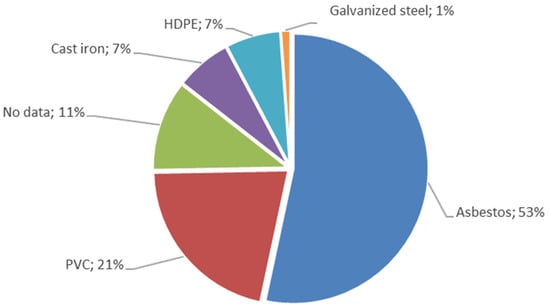 The WDN in La Calera is fully gravitational, with a total length of 86.6 km. The pipe sizes range from DN50 to DN300; with sizes below DN100 representing 55% of the total WDN. The main pipe material is asbestos, which represents 53% of the total length of the network. The second largest material in proportion is polyvinyl chloride, PCV, which amounts for 21%. Other materials such as cast iron, high-density polyethylene, HDPE, and galvanized steel appear in minor proportions. The percentage of each pipe material is shown in Figure 3. Asbestos pipes, which represent the highest proportion of the WDN, are among the oldest assets in many WDNs and are usually prone to high leakage rates [57].