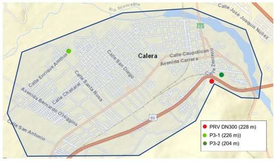 La Calera city’s water loss was analyzed in detail by Sotomayor in 2012, estimating an NRW value of 47%. This author concluded in his report that losses in La Calera are due to physical losses [54]. This value is higher than other locations run by ESVAL, so it was chosen to implement an advanced pressure management scheme and evaluate the benefits. The advanced pressure management scheme is based on a model that relates the inlet flow versus the headloss between the outlet of the valve and the critical points. This approach is used to achieve maximum pressure reduction in the area while assuring the level of service to the customer, especially during peak demand [20].
