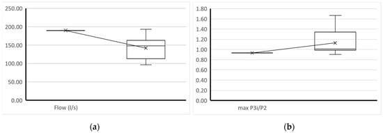The value (Q3 − Q1) is the difference between the third quartile and the first one. The maximum and minimum values are set with a 95% confidence interval for the median. If there are outliers, these will appear above or below the maximum or minimum values. The following figure shows box charts for each of the variables used to build the model. Figure 6a shows the variable flow, and Figure 6b shows the maximum value obtained from the pressure ratios for the two critical points.