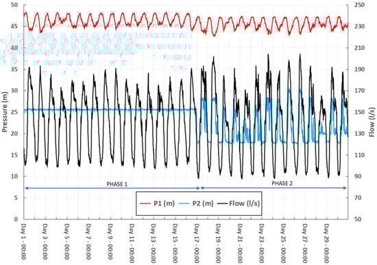 The project is split into two different phases, which are described in Figure 6 and Figure 7. Phase 1 corresponds to the original performance of the valve, working on a fixed outlet mode, and phase 2 shows the pressure and flow data when the advanced PM scheme is implemented on the valve. Despite the fact that it would have been ideal for showing all the data in the same graph, the authors decided to include two different graphs in order to be able to see all the information properly in a good manner, avoiding data overlay.