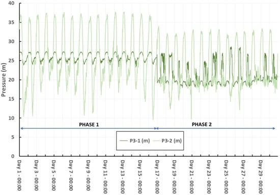During phase 1, P2 keeps a fixed value of 25.59 m at the outlet of the valve. The pressure at the critical points, P3-1 and P3-2, presents great variation. They are much higher during the night period when the demand is lower, and lower at peak demand when the inlet flow to the La Calera area is higher.