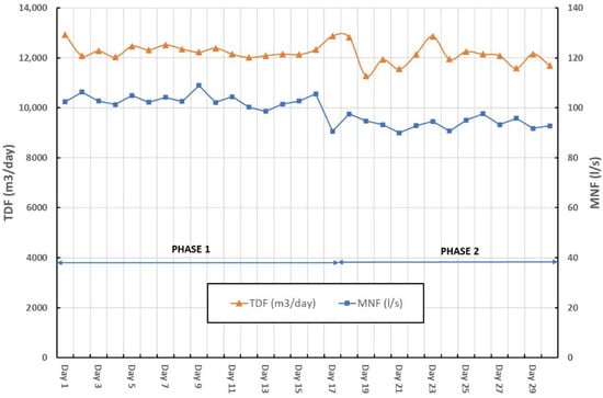 Since the advanced PM scheme was introduced in the DMA on day 17, there was a reduction in the MNF as a consequence of the night pressure reduction. Despite the reduction in the night flow, TDF remains almost the same since the DMA pressure increases during the day to satisfy the existing demand and improve the level of service to the customers. Table 4 displays the average MNF and TDF during each of the phases.