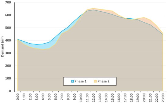 In phase 2, when the PM control model is implemented, P2 varies dynamically according to the demand and the restriction imposed by the optimization control scheme. As a result of this, the pressure in the critical points is reduced during the night period and increased during the day from the original situation. This generates leakage reduction during the night period and increases flow during the day.