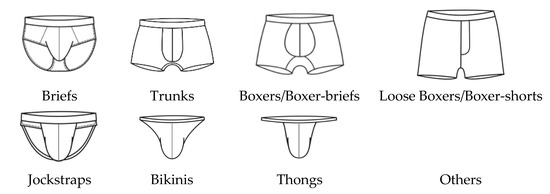 - Shuangpo, L.; Pengpeng, C. Market survey questionnaire and analysis of men’s underwear. Text. Ind. Tech. 2019, 48, 66–68. [Google Scholar]