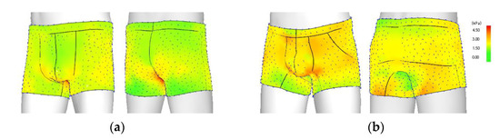 From the respondents’ feedback, the most uncomfortable feeling and the “general” style of underwear have higher correlation coefficients with a significant 0.001 level. However, for very tight-fitting and very loose-fitting styles of underwear, there was an uncomfortable feeling in the waistband. For the uncomfortable feeling of being tightly supported in the front area, it is found that respondents have good acceptance from general to very tight-fitting. Furthermore, some uncomfortable situations are caused by the front and crotch which we can evaluate as a defect of structural design. Therefore, it is necessary to optimize this part. We can further explain this uncomfortable problem through the models with the same material properties and design ease, the trunks (Figure 3a) and the self-designed men’s boxer-briefs with multiple construction lines and corrective function (Figure 3b).