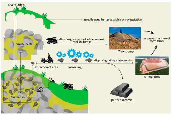 Mining negatively impacts soil structure in several ways; the underground ore extraction leads to the subsidence of land [7]. Therefore, vertical leakage of nutrients and impairment of the soil microbial community occur [8]. The open-pit mining is more harmful as the vegetation and soil from the surface is relocated, leaving behind a barren land. Moreover, mining waste which is deposited in tailing ponds and dumps can cause heavy metal pollution. Mining wastes pose serious threats to environmental and human health via the contamination of soil and water with toxic metals [9,10,11]. These are mobilized through the acid mine drainage formed because of the contact between water and sulfur-bearing minerals [12,13].