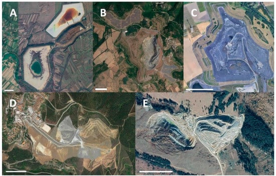 Influence of mining activities on natural landscapes. Illustrated mining sites are located (A) in proximity to Baia Mare (Romania); (B) near Villaniere and Salsigne (France); (C) near Kamp-Lintfort (Germany); (D) Panasquiera Mine, Barroca Grande (Portugal); (E) Rodnei Mountains, Suceava county (Romania). Identification of mining sites and visualization of images were done using the data set developed by Maus et al. [24] available on FINEPRINT Geovisualisations database. Scale bar: 300 m.
