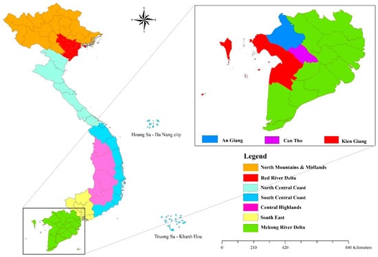 Figure 2. Study region and An Giang, Can Tho, and Kien Giang provinces in MRD, Vietnam. Source: Adopted from Tuyen, Sirisupluxana, Bunyasiri and Hung [108].