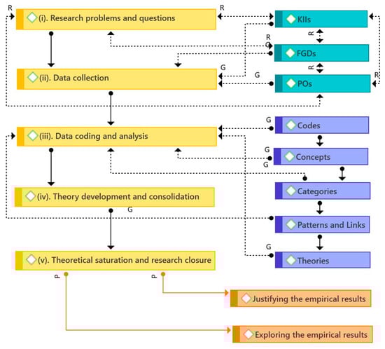 Figure 3. Research processing and analytical framework for the qualitative approach. (Note: Symmetrical dashed arrows with the letter R mean “is associated with”, transitive dashed arrows with the letter G represent “is a part of”, asymmetric solid arrows indicate the orders between components, and asymmetrical solid orange arrows with the letter P mean “is a property of”). Source: Adapted and adopted from Hoang [118] and Tuyen, Sirisupluxana, Bunyasiri and Hung [108].