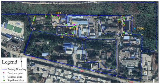 The deployment of testing points and sampling points was based on the principle of zoning the functional area, and the deployment range covers the entire fumaric acid brownfield site [19]. We set up this study’s rapid testing points, deep sampling/testing points, and control points. The locations of these sample points are shown in Figure 2.
