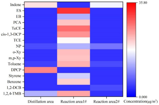 The concentration of organic components in the atmosphere of the fumaric acid brownfield sites was detected and identified (Figure 3). As can be seen from Figure 3, VOCs were detected in the distillation area, reactor area 1, and reactor area 2. A total of five VOCs (1,2,4-trimethylbenzene (1,2,4-TMB); dicyclopentadiene (DCPD); toluene; naphthalene (NP); and indene) were quantitatively detected in the distillation area. The average concentration was 5.07 μg/m3; among them, DCPC had the highest concentration of 18.54 μg/m3. A total of 13 VOCs (1,2,4-TMB; benzene; styrene; toluene; m,p-xylene(m,p-Xy); o-xylene(o-Xy); NP; trichloroethylene(TCE); cis-1,3-dichloropropene(cis-1,3-DCP); Tetrachloroethylene(TeCE); pentachloroethane(PCA); Ethylbenzene(EB); Ethylsulfide(ES)) were quantified in reactor area 1 with an average concentration of 10.12 μg/m3, with the highest concentration of 35.76 μg/m3 for ES. A total of six VOCs (1,2-dichlorobenzene(1,2-DCB); toluene; m,p-Xy; o-Xy; NP; Indene) were quantified in reactor area 2 with an average concentration of 0.67 μg/m3, with the highest content of indene at 2.90 μg/m3.