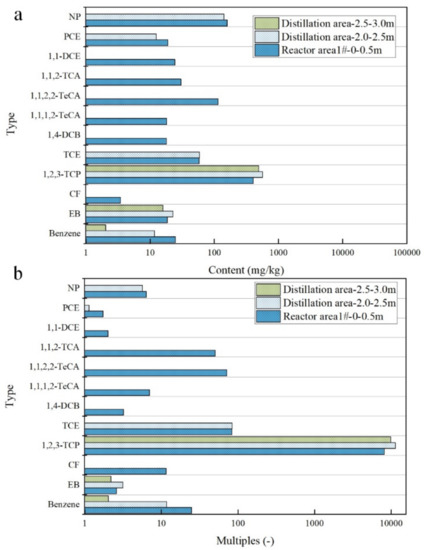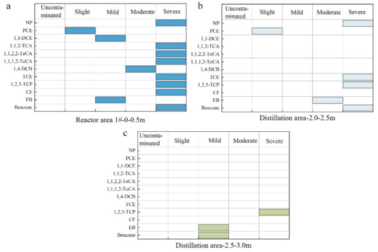 From Figure 6a–c, it can be seen that the surface soils were contaminated with different degrees of organics. In the reactor area 1 0–0.5 m, there were eight VOCs (Benzene; CF; 1,2,3-TCP; TCE; 1,1,1,2-TeCA; 1,1,2,2-TeCA; 1,1,2-TCA; NP) that were shown to be severely polluted. The Pi of 1,4-DCB was 3.20, so 4-DCB led to moderate pollution; the EB and 1,1-DCE were mild pollution; and TeCE belongs to slight pollution due to the Pi of was 1.72.