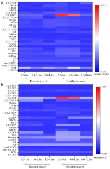 Among all the VOCs, 1,2,3-TCP had the highest content and the most extensive exceedance times; the limit values (0.05 mg/kg) exceeded 8101.78-, 11,291.80-, and 9880.36-times at 0–0.5 m in reactor area 1, 2.0–2.5 m, and 2.5–3.0 m in the distillation area, respectively. Therefore, 1,2,3-TCP was the primary organic pollutant in the surface soil of reactor area 1 and distillation area.