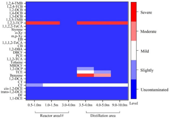 According to Figure 7, it can be seen that the soils located in the deeper layers showed relatively slight pollution, and most of the VOCs belong to uncontaminated levels. Nevertheless, there were still five VOCs in the pollution level (CF; Benzene; TCE; 1,2,3-TCP; 1,2-DCP). The Pi of 1,2,3-TCP in reactor area 1 3.0–4.0 m was below 1, and in other areas were all over 5, so 1,2,3-TCP led to severe pollution. CF led to slight pollution at 0.5–1.0 m in reactor area 1 and showed mild pollution at the other depths. In the distillation area at 3.5–4.0 m and 4.0–5.0 m, benzene caused severe and moderate pollution, respectively; TCE had mild pollution at 3.5–4.0 m and had slight pollution level at 4.0–5.0 m. The Pi of 1,2-DCP at 3.5–4.0 m in the distillation area was 1.28, thereby leading to slight pollution.