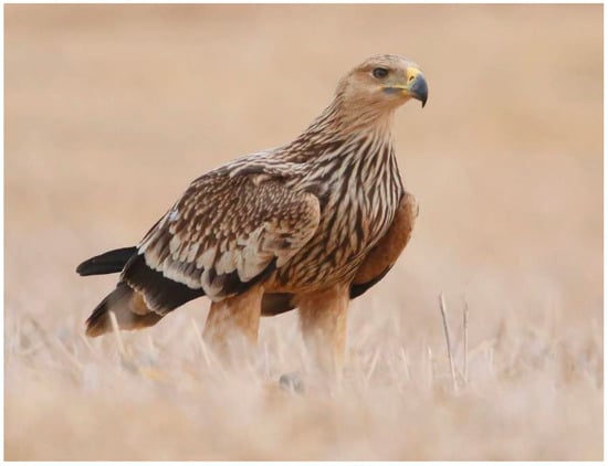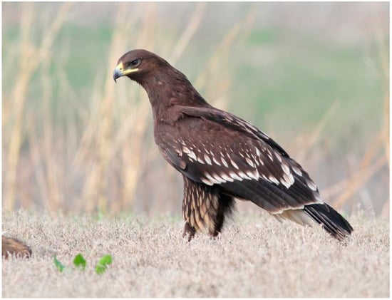 - Poessel, S.A.; Bragin, E.A.; Sharpe, P.B.; Garcelon, D.K.; Bartoszuk, K.; Katzner, T.E. Movements and landscape use of Eastern Imperial Eagles Aquila heliaca in Central Asia. Bird Study 2018, 65, 208–218. [Google Scholar] [CrossRef]