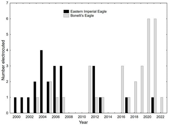 The number of wintering Eastern Imperial Eagle (Aquila heliaca) and Bonelli’s Eagle (Aquila fasciata) killed at power-lines in the Judea Region, Israel, between the years 2000 and 2021 (N = 22 years). The data for the years 2000–2007 from Hadad and Moyal [37], and 2011–2021 are courtesy of the Scientific Data Department of the Israel Nature and Parks Authority. Eastern Imperial Eagle denoted in black, Bonelli’s Eagle in grey.