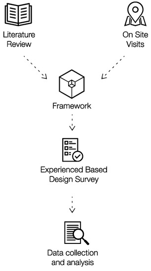 In this way, a virtual test of the new installations was possible to verify the effectiveness of the prototype in advance according to the stakeholder requirements. On-site visits, semi-structured interviews with shopkeepers, and scoping literature reviews identified important features to be verified. The development of such a survey and its application followed five different steps exemplified in the flowchart reported in Figure 1 and described below.