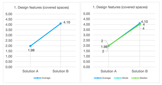 Concerning design features and, in particular, the possibility of being covered from the sun or rain, the current urban situation/configuration (Solution A) received an average score of 1.98/5 with mode and median equal to 2, which means that most of the respondents feel that Solution A is not able to protect public space users from sun or rain. On the contrary, Solution B received an average score of 4.10 with mode and median equal to 4, which shows that most respondents strongly agree that the new public space is able to offer covered space for city users (Figure 2). This fact is very important because SGL is in a particularly rainy geographical area.
