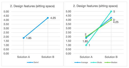 Comparison between Solution A and Solution B from question 2. Design features (sitting space): average, mode, median.