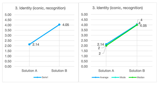 Comparison between Solution A and Solution B from question 3. Identity (iconic, recognition): average, mode, median.