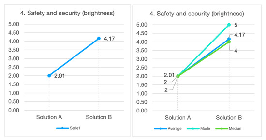 Comparison between Solution A and Solution B from question 4. Safety &Security (brightness): average, mode, median.