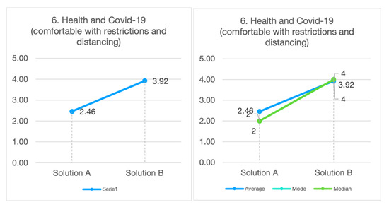 Comparison between Solution A and Solution B from question 6. Health and COVID-19 (comfortable with restrictions and distancing): average, mode, median.