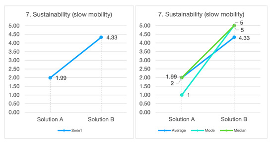 Comparison between Solution A and Solution B from question 7. Sustainability (slow mobility): average, mode, median.