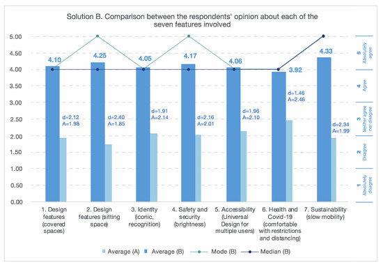 The highest average value was obtained by 7. Sustainability (slow mobility), with a score of 4.33/5, followed by 2. Design features (sitting space), with a score of 4.25/5, and 4. Safety & Security (brightness), with a score of 4.17/5. Generally, those aspects are also the ones that improved the most in comparison with the existing situation; there are 2.34, 2.40, and 2.16 points of improvement between Solution A and Solution B, respectively, which moves from a general area of disagreement to an area of absolute agreement with the specific statements. On the contrary, the lowest areas, which scored slightly lower on average, are: 3. Identity (iconic, recognition) with a score of 4.05/5 and 6. Health and COVID-19 (comfortable with restrictions and distancing) with a score of 3.92/5. Nevertheless, it is interesting to notice that, compared to Solution A, both the aforementioned areas improved respectively by 1.91 and 1.96 points, which moved the perception of people closer to an agreement with the specific statements. The results are consistent with the existing studies on Urban Public Health and COVID-19 resiliency of Urban Public Spaces [54].