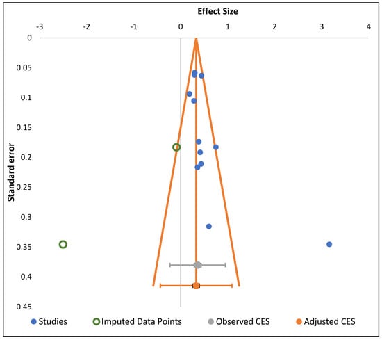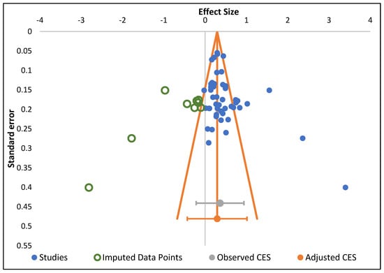 In subgroup analyses, neither the quality of engagement (p = 0.81), nor the type of contact (p = 0.73), nor the timing of intervention (p = 0.28) were significant predictors of effect size for nature connectedness. Results were scrutinised for publication bias; Rosenthal’s failsafe-N was 6628, indicating that should many additional relevant studies with null results be added, the overall effect size would likely remain significant. However, the funnel plot for the effect sizes appeared to be asymmetric, suggesting there may be evidence of publication bias (see Figure 2). In addition, both Begg and Mazumdar adjusted rank correlation (τ = 0.19, p = 0.05) and Egger’s intercept (Intercept = 1.71, t = 2.42, p = 0.02) were significant, which indicates possible evidence of a publication bias for these data. The impact of the publication bias was assessed by estimating the effect if the bias was absent, by using the Duval and Tweedie trim and fill method [63]. This method removes the most extreme effect sizes from the funnel plot and then re-calculates the effect size to make the funnel plots more symmetrical around the new suggested effect size [63]. Nine data points were imputed on the left of the funnel plot. The adjusted effect g = 0.30 [95% CI 0.26, 0.33] p < 0.01 was smaller but still represents a significant, positive effect. Relatedly, sensitivity analyses by deleting each study in turn from the analysis [64], indicated that Keenan et al. [40] was a notable outlier; omitting that study reduced the effect, g = 0.42 [95% CI 0.30, 0.54], but still represents a significant, positive effect (p = 0.001).