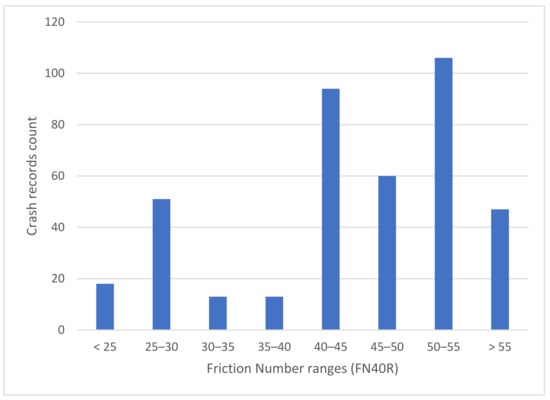 Concerning roadway and environmental characteristics, the friction values ranged from 23 to 68 and the average value was 44. Figure 1 presents the friction data for the analyzed crash records count. In addition, unsignalized intersection crashes accounted for a minority of the crash records (28%). Adverse weather-related crashes and crashes that occurred on non-dry roads constituted 22% and 36% of the total crashes, respectively. The term “adverse weather” refers to conditions such as raining, snowing, and any other unfavorable conditions. It is well-known that precipitation and contamination are significantly affecting skid resistance of the pavement surface as they act as a coating layer and prevent direct contact between tires and the pavement surface []. It should be noted that Figure 1 only presents the distribution of friction numbers across the analyzed dataset. Friction data were matched to the crashes that occurred in the same year and at the same location of friction measurement.