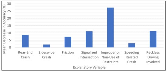 As shown in Figure 2, the top critical explanatory variables, as per the mean decrease in accuracy metric, were the improper use or non-use of safety restraints, reckless driving, and signalized intersections. These findings are in line with Bham et al. [], Weiss et al. [], and McGee [], respectively. This procedure demonstrated that these factors should be investigated in further analysis using the proposed probit model since they are the top critical explanatory variables. It should be noted that the mean decrease in accuracy demonstrated that “adverse weather” was not a significant explanatory variable.