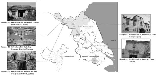 This paper takes five vernacular dwellings in northern Jiangsu as the research object, considering three aspects. First of all, northern Jiangsu is located in the transitional area between the north and south of China, and its vernacular dwellings also reflect the grand and plain northern style, which is essentially different from the delicate and simple style in southern Jiangsu. Secondly, the ecological characteristics of the traditional construction techniques used in some vernacular dwellings in northern Jiangsu, including walls with raw earth inside and baked brick outside, a herringbone beam frame and a roof truss without folding [], are also in line with the local climate adaptability; thus, it is necessary to continue this living characteristic through conservation. Thirdly, the five vernacular dwellings selected in this paper cover different cities, and their scale and subordination are relatively typical. Although these five dwellings cannot completely represent the overall situation of vernacular dwellings across northern Jiangsu, they can provide a reference for the protection and development of vernacular dwellings, as well as a relevant research case for improving local economic and social development and for solving the problem of unbalanced development across the province