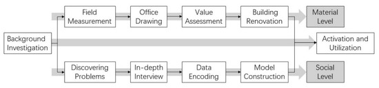 In view of the above situation, this paper tries to combine the traditional surveying and drawing of vernacular dwellings with in-depth interviews based on grounded theory, so that studies on the material, social, and humanistic levels can complement each other. Then, the overall analysis and research of relevant cases can be carried out, and case study materials can be enriched to the greatest extent, thereby providing strong support for the subsequent conservation and inheritance of vernacular dwellings. The overall research method framework is shown in Figure 2.
