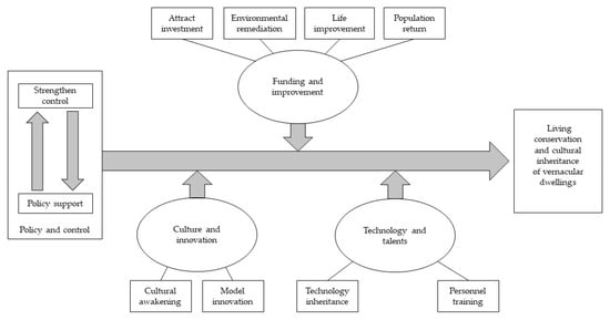The inheritance of traditional construction technology should be strengthened, and talents should be trained in northern Jiangsu, while minimizing the influence of southern dwelling culture on the local area. In addition, it is also necessary to stimulate the awareness of protection and inheritance of indigenous people and local governments in northern Jiangsu, as well as select or learn from the operation modes of vernacular dwellings in different regions. Figure 4 describes the relationship between each process in the form of a strategy model of living conservation and cultural inheritance of vernacular dwellings.