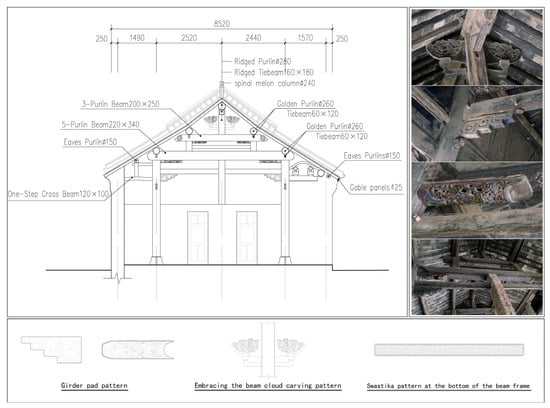 In contrast to the lack of historical context, the five vernacular dwellings embody high artistic, technical, and cultural value as an architectural carrier. Sample 2 in Pei County was taken as an example, which was ignored by the government and management departments in the past. However, in the survey, it was found that the architectural level of this dwelling is very high, wherein an extremely rare lifting-beam wood structure has been adopted. At the same time, there are a large number of decorative patterns on the wooden structure, reflecting the once prominent position of the owner. In addition, the gable wall head of the dwelling was carved from a whole stone, and a whole bluestone was used outside the main gate, which is also very rare. All of these elements reflect the artistic, technical, and cultural value of this vernacular dwelling (Figure 6).