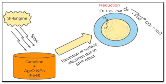 Nanoparticles increase the surface area, and thus reaction rates will increase. Furthermore, the light from the spark plug in the engine strikes the surface of the blended samples at specific angles of incidence to excite the electrons’ surface owing to an oscillation mode known as surface plasmon resonance “SPR.” In other words, this mode generates a large quantity of energy, which causes excitation of these electrons for a longer period than typical. Resulting in higher reaction rates with oxygen to create free radical oxide “O·” that reacts with fuel to produce CO2 and H2O, reaching almost complete combustion [44,45] as shown in Figure 3. The Ag2O and MnO2 nanoparticles in fuel work as an oxygen buffer, providing additional oxygen for carbon to convert into CO2 directly by using Ag2O and in two steps by using MnO2. On the other hand, it can also oxidize CO to CO2 directly by using O2 of excess air as shown in the Equations below; lowering CO emissions as shown in [46,47,48]