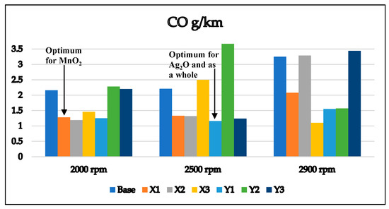 Figure 5 revealed that the maximum excess O2 was at Y1 (2500 rpm) so the rate of reactions at this condition was limited, and thus a significant decrease was indicated in the percentage of CO and NOx to reach 1.16 and 0.0007 g/km, respectively, according to EURO 6 as shown in Figure 4 and Figure 6. Moreover, the percentage of CO2 decreased to the approximately lowest value at Y1 (2500 rpm), which indicated a high impact on decreasing global warming in the world, as shown in Figure 7. Generally, Figure 5 illustrated increasing in O2 percentage for Y samples to support the new theory of silver oxide nanoparticles in spite of decreasing in percentage for X samples.