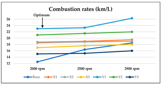 Nanoparticles enabled combustion at low pressure and temperature and provided an earlier spark, resulting in less time spent in this process. As a result, the output power accelerates faster than usual, resulting in more kilometers traveled per liter of mixed gasoline, as shown in Figure 8. The combustion rates of most blended fuels were much higher than those of the base fuel. For example, the optimum sample Y1 had the highest combustion rates of 23, 23.3, and 26.3 km/L at 2000, 2500, and 2900 rpm, respectively, when it was compared to those 12.5, 16.4, and 18 km/L at 2000, 2500, and 2900 rpm respectively of the base fuel.