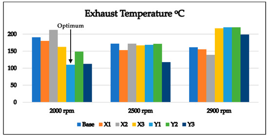 Figure 9 illustrates the base sample’s exhaust temperature compared with blended samples. Through the results, it could be observed that at a low speed (2000 rpm), the exhaust temperature of all blended samples was lower than the base sample except sample X2. However, at the medium speed (2500 rpm), all the blended samples’ exhaust temperatures were equal to or less than the base sample, while at high speed (2900 rpm), the exhaust temperatures of most blended samples were higher than the base sample. Finally, the Y1 sample represented the optimum case because the normal range of speeds was between 2000 and 2500 rpm.