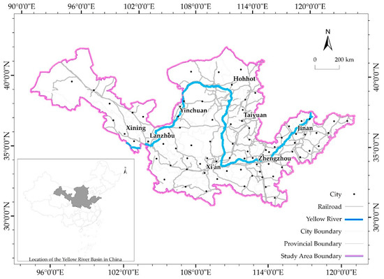 Based on the natural basin of the Yellow River, the study area was defined as the eight provincial administrative regions of Qinghai, Gansu, Ningxia Hui Autonomous Region, Inner Mongolia, Shanxi, Shaanxi, Henan, and Shandong provinces, through which the Yellow River flows, with prefecture-level cities (states and leagues) as the smallest study unit, taking into account the integrity of the study geographical unit, regional development, and direct correlation with the Yellow River [30]. Among them, Gannan Tibetan Autonomous Prefecture, Hainan Tibetan Autonomous Prefecture, Guoluo Tibetan Autonomous Prefecture, Yushu Tibetan Autonomous Prefecture, Linxia Hui Autonomous Prefecture, Gannan Tibetan Autonomous Prefecture, Xilingol Meng, Alashan Meng, and Tongchuan City have not opened railroads. The four eastern leagues of Inner Mongolia are naturally closely connected with the northeastern region and were not included in the scope of the study area. Sichuan province is included in the Yangtze River Economic Belt, and the Yellow River flows in Sichuan province only through the Aba Tibetan and Qiang Autonomous Prefecture and the Ganzi Tibetan Autonomous Prefecture, which has less influence. Finally, 80 prefecture-level cities (states and leagues) with a total area of about 1,439,800 km2 were identified in the Yellow River Basin (Figure 1).