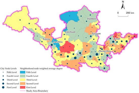 From the spatial distribution pattern of the average weighted degree of neighbor nodes, the average weighted degree of neighbor nodes in higher-level cities was lower, while the average weighted degree of lower neighbor nodes was distributed around higher-level cities in a fan-shaped distribution spatial pattern, indicating that there were more communication and interaction opportunities between the lower-level city nodes and higher neighbor nodes with average weighted degree nodes. Although the number of lower and lower neighbor nodes with average weighted degree nodes was smaller, the more obvious spatial difference could give more convenience and options for inter-city transmission links (Figure 3).