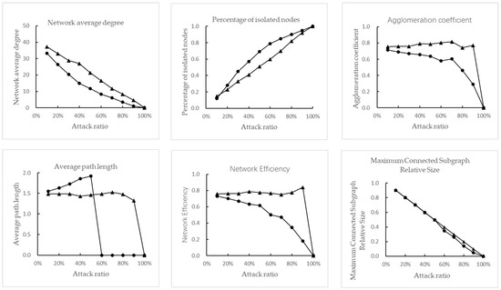 The network resilience characteristics were explored by using a computer simulation to simulate random attacks and deliberate attacks on the urban networks in the Yellow River Basin using Python programming with scaled node deletion. The changes in the six characteristic values of network average degree, isolated node proportion, agglomeration coefficient, average path length, network efficiency, and relative size of maximum connectivity subgraph when the urban network is attacked were calculated and used in the vulnerability analysis of the urban network in the Yellow River Basin (Figure 4).