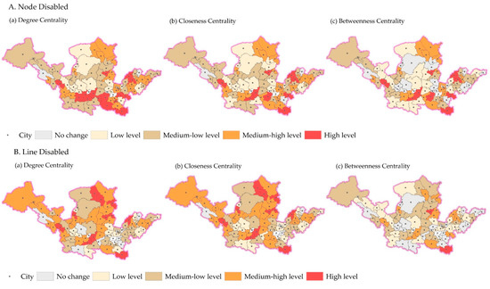 In terms of betweenness centrality, the mean values of betweenness centrality were 0.0064 and 0.0094 for the node failure and line failure states (Figure 7(Ab,Bb)), respectively. When the nodes failed, the medium and high levels were mainly distributed along the Longhai Railway, and the impact on the provincial capital cities was more significant, reflecting the weakening effect on the transit function of the railroad corridor under the failure of the core railroad hub, and the medium-low levels and low levels were farther away from Zhengzhou. When the line failed, all the railroad lines related to Zhengzhou failed, and the medium and high levels were distributed along the Beijing–Guangzhou Railway and Longhai Railway in an axial belt with Zhengzhou as the core.
