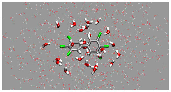 These four terms, when combined, provide the fifth value of the total interaction energy at the SAPT2 level. The interaction energy is calculated by definition using the structures of the monomers taken from the dimer so that the effects of structural relaxation are not present. The SAPT calculations were prepared with PSI4 1.3.2 program [44]. The last considered approach to the structural investigations was to generate larger microsolvation models by including the water shell of molecules closer than 3.5 Å to the solvated PCB molecule in five snapshots taken (at regular intervals of 1 ns starting at 0.5 ns of the production run) from classical molecular dynamics for each of the five PCBs, obtaining 25 microsolvated models. An example of such a shell is shown in Figure 1. This post-processing step and preparation of the corresponding figure were carried out with the VMD 1.9.3 program [41]. The PCB–water interaction energy for the generated microsolvation models was then calculated at the RI-MP2/def2-TZVP level. These quantum-chemical calculations were performed with the ORCA 5.0.3 package [35,36].