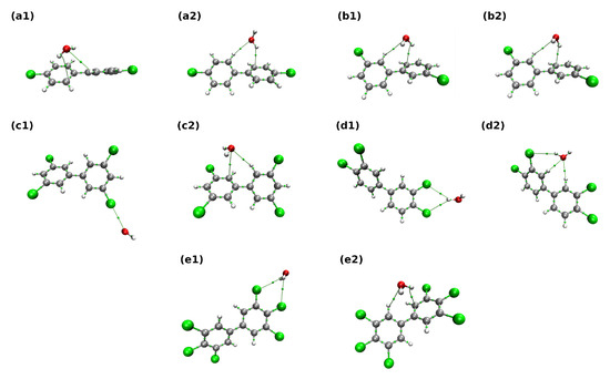 The complexes of PCB15 and PCB11 (each ring has only one chlorine substituent) with water exhibit a preference of the water molecule to interact rather with –H than –Cl functions, even if the geometry optimization started from the O–H · · · Cl–C arrangement—see the structures a1 and b1 in Figure 2. The more chlorine-rich PCBs are more likely to form water–chlorine atom interactions, visible in the structures c1, d1, and e1. Systems with classical, medium, or strong hydrogen bonds (HBs) prefer arrangements in which the role of HBs is maximized; here, we observe that the competitive and alternative bond paths are formed, e.g., in the a2 structure: both O–H · · · C and C–H · · · O contacts are visible. Further, the presence of at least two closely positioned –Cl atoms in PCB77 and PCB169 leads to interesting bifurcated O–H · · · Cl–C contacts, where two chlorine atoms are engaged by the same hydrogen atom of the water molecule—see the structures d1 and e1 in Figure 2. The presence of BCPs and bond paths indicates, however, merely the existence of interaction, while more details can be inferred from the numerical values of the relevant BCP properties. Noteworthy is the fact that averaged sums of estimated energies for all complexes are equal to 1.222 kcal/mol for PCB–water and 1.539 kcal/mol for PCB–chlorine ones. As seen in Table 1, the electron density ρ at the BCPs is very low and does not exceed 0.01 e · a 0 3 . In each case, however, the value of ρ is larger than the lowest boundary, 0.002 e · a 0 3 , assumed in the criteria of Koch and Popelier [51]. The values of electron density Laplacian are positive, according to expectation, but in many cases are lower than the threshold of 0.024 e · a 0 5 given in [51]. The simple but effective approach of Espinosa [45] allowed us to estimate the contributions of individual interactions to the total interaction energy between the PCB and water molecule. The E1 values given in Table 2 are between 0.617 and 1.937 kcal mol 1 , placing the intermolecular HBs at the lower (weaker) range of energies.